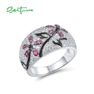 9. SANTUZZA 925 Sterling Silver Ring Red Green Spinel Cubic Zirconia Sweet Flower Jewelry