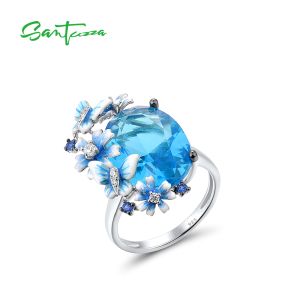 12. SANTUZZA 925 Sterling Silver Rings Shiny Oval Blue Stone Enamel Flowers Butterfly Ring Jewelry