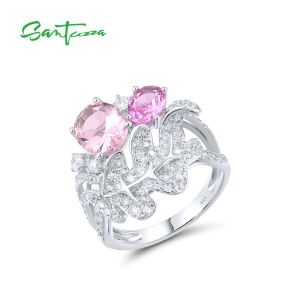 15. SANTUZZA 925 Sterling Silver Rings Created Pink Sapphire White CZ Leaf Ring Fine Jewelry