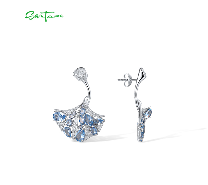 SANTUZZA 925 Sterling Silver Earrings Sky Blue Spinel White CZ Vivid Leaf Jewelry